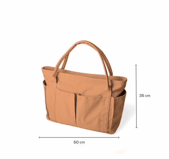From market trips to picnic outings, the Canvas Pocket Tote Bag in Terracotta is your versatile companion for all occasions. Crafted from durable canvas material, this tote stands upright for easy access to your essentials. It features a spacious main compartment with a zipper closure to keep your items secure. With four exterior pockets—two on the sides and two in front—and an additional interior pocket, you'll have organised storage for all your belongings.