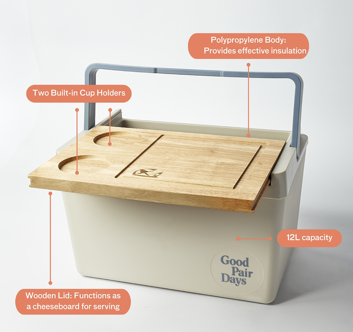 - 1 x Wooden Lid that doubles as a cheeseboard with built-in cup holders.