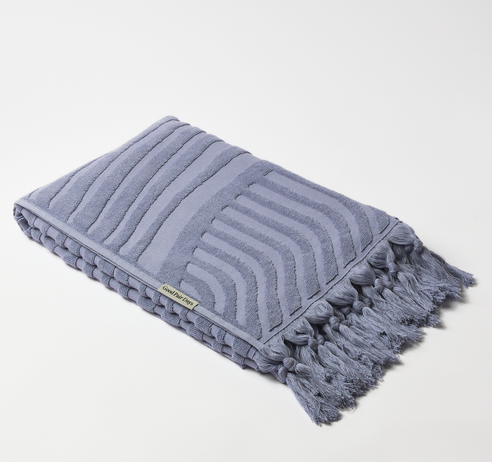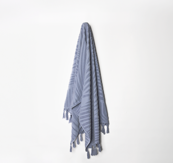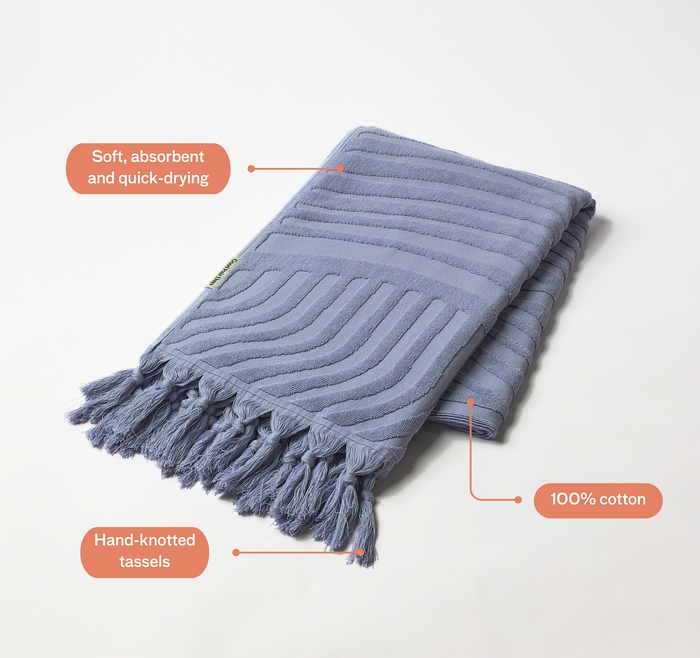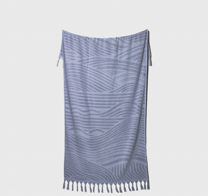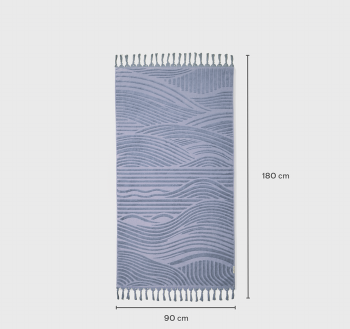 Enjoy a perfect beach day with our Luxe Wave Beach Towel in sky. Crafted from 100% cotton and featuring a serene textured 3D wave design, this towel is the ideal companion for drying off after a swim or lounging with your favourite drop. Its generous size provides ample space for relaxation, whether you're at the beach, poolside, or enjoying a picnic. Lightweight and easy to carry, this towel combines practicality with a modern wave aesthetic.